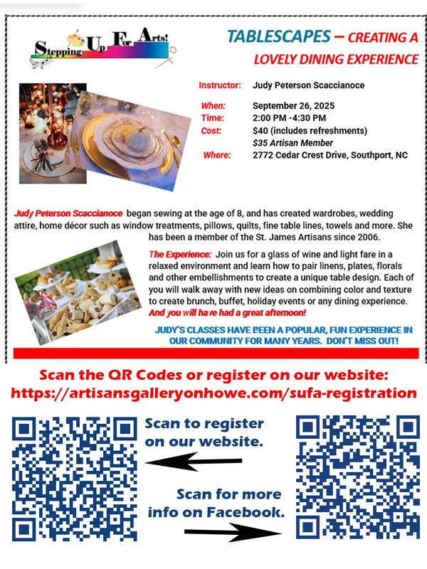 To register, send your registration form and check of $110 (Artisan Members - $100) made out to SUFA and mail it to Donna Ferrandino, 5989 Gray Squirrel Path, Southport, NC 28461. For more information, contact Donna Ferrandino at ferrandinod@yahoo.com or scan the QR code to connect to our 2025 SUFA Workshops Event page on Facebook.